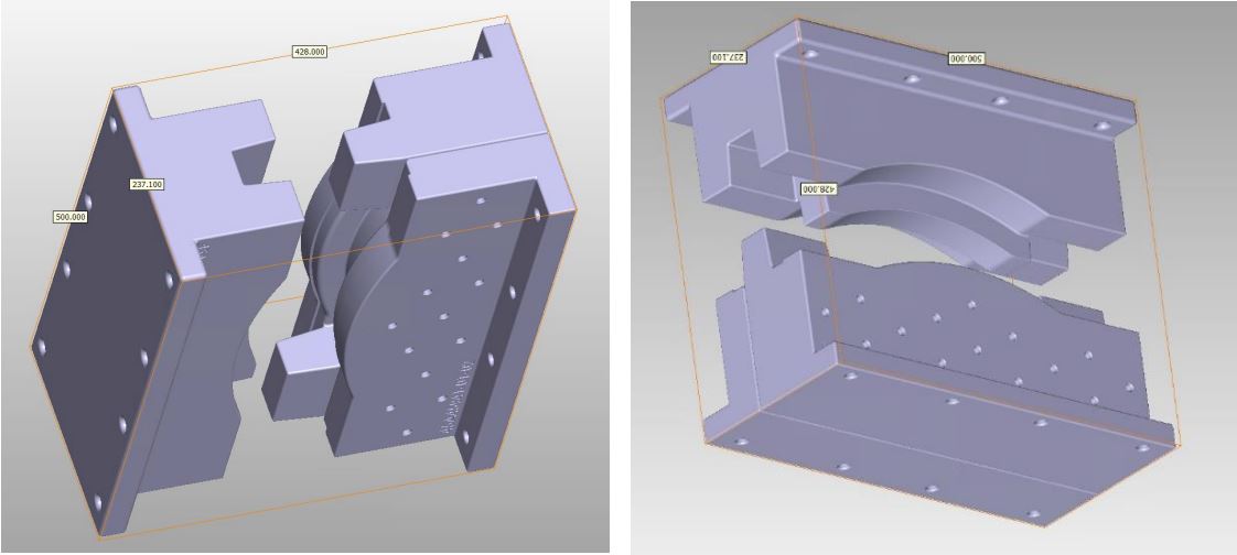 Die Umformwerkzeuge, die aus Natursand und Furan-Bindemittel bestehen, wurden bei der ExOne GmbH in Gersthofen mit dem Binder-Jetting-Verfahren gedruckt. Im Vorfeld des Druckprozesses wurde ein digitales CAD-Design der Sandformen, die aus zwei Teilen bestehen, erstellt (siehe Bilder). Die gesamte Druckzeit betrug 6 Stunden bei Verwendung von Standard-Parametern.
